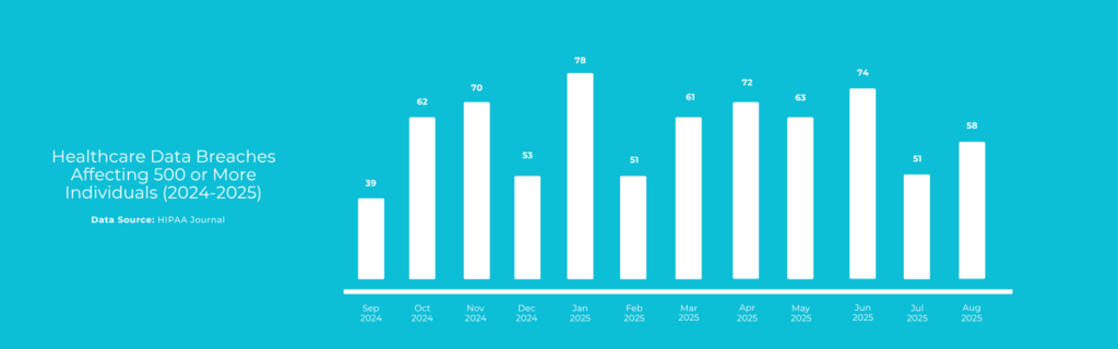 Weak technical measures: Such as deploying obsolete firewalls or weak passwords, or failing to encrypt sensitive information, are among the most common Security Rule violations. Healthcare systems are a frequent focus of hackers because PHI is so valuable on the black market. For example, the 2025 Healthcare Data Breaches report found that in August 2025 alone, 58 healthcare data breaches (each affecting 500 or more individuals) were reported to the Office for Civil Rights (OCR), exposing the protected health information of 3.79 million people through misconfigurations, unauthorized access, or other technical failures.